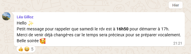 Dernier message Whatsapp du groupe Auteur/autrice de la publication :stephanetheler@yahoo.fr Publication publiée :juin 9, 2025 Post category:Uncategorized Commentaires de la publication :0 commentaire Vous devriez également aimer Hello chanteurs et chanteuses mai 7, 2023 Dates importantes de la saison 25-26 avril 3, 2025 Apprenons à nous connaître août 26, 2023 Laisser un commentaire Annuler la réponseCommentEnter your name or username to comment Enter your email address to comment Saisir l’URL de votre site (facultatif) Enregistrer mon nom, mon e-mail et mon site dans le navigateur pour mon prochain commentaire.